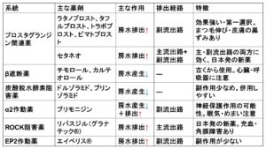 代表的な薬には、プロスタグランジン関連薬(ラタノプロストなど)EP2受容体作動薬(オミデネパグなど)β遮断薬(チモロールなど)炭酸脱水酵素阻害薬(ドルゾラミドなど)α2受容体作動薬(ブリモニジンなど)Rhoキナーゼ阻害薬(リパスジルなど)の6種類があります。